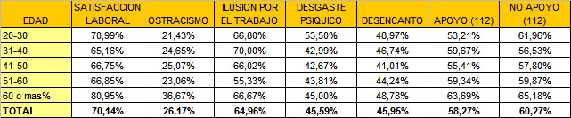 Los niveles que presentan los factores de desencanto (45,95%) y desgaste psíquico (45,59%) son bajos, pero han de ser vigilados ya que, cualquier situación negativa puede desembocar en una subida de estos niveles y posiblemente los niveles de satisfacción e ilusión podrían bajar.